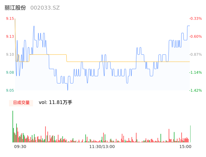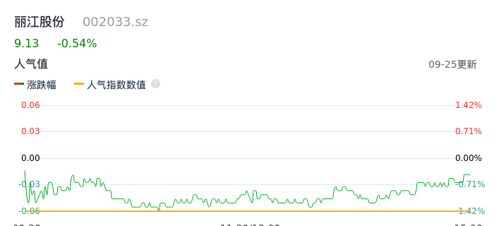 09月25日,丽江股份收报9.13,股价涨幅-0.54%,成交金额1.07亿元,换手率2.15%。