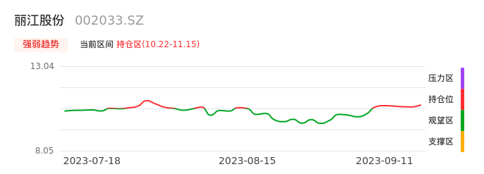 我们来看一下该股的九方特色指标强弱趋势的情况:丽江股份自09月04日从观望区上穿到持仓区。股价近期在多头区域持续强势上扬,上升动能仍较为充足,可积极关注。后续重点关注上方压力位:11.15元是否能突破上攻。