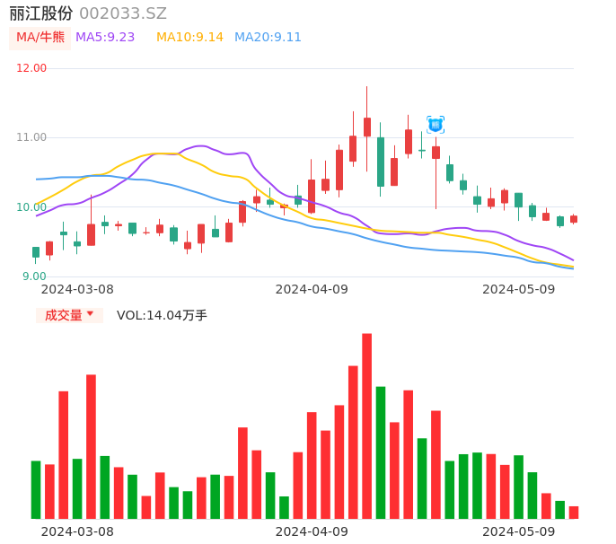 05月09日,丽江股份收报9.87,股价涨幅1.44%,成交金额1.38亿元,换手率2.56%。