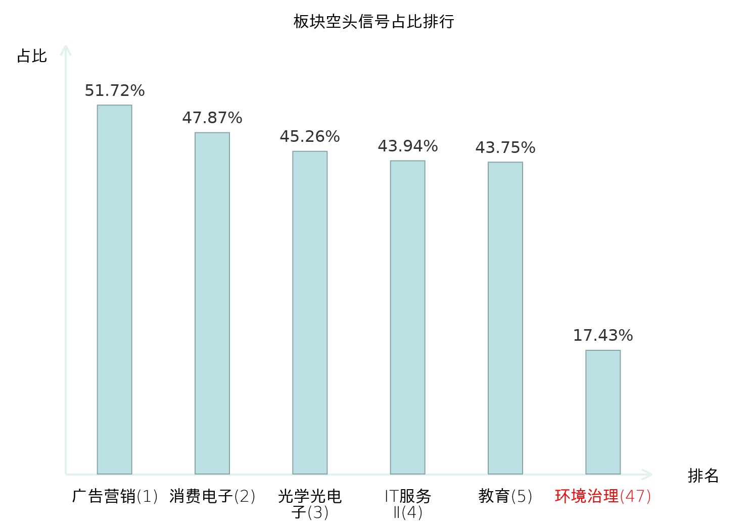 全市场所有行业板块中主力空头信号占比排名中,广告营销板块位居第一。广告营销板块名次提升最快,较昨日上升115位。