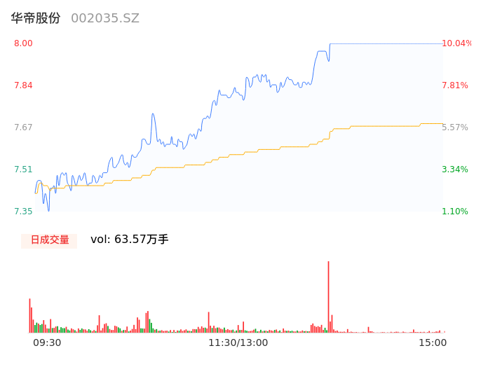 05月06日,华帝股份收报8.00,股价涨幅10.04%,成交金额4.89亿元,换手率8.14%。