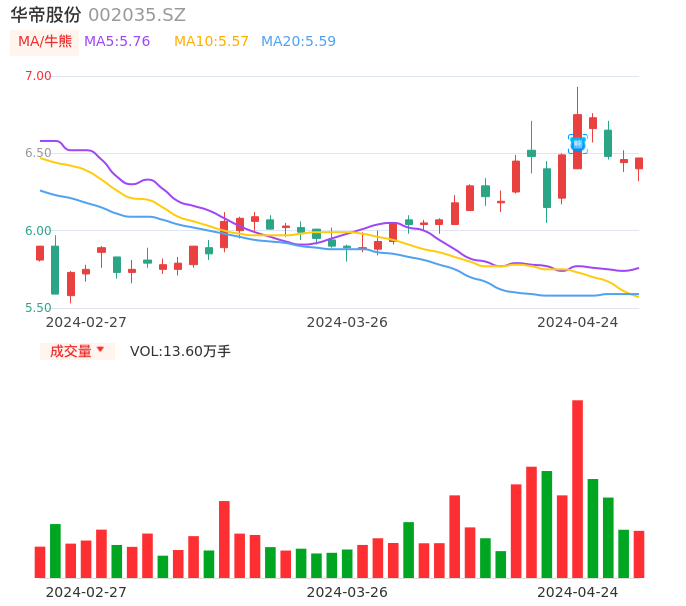 04月24日,华帝股份收报6.47,股价涨幅0.15%,成交金额8697.05万元,换手率1.74%。