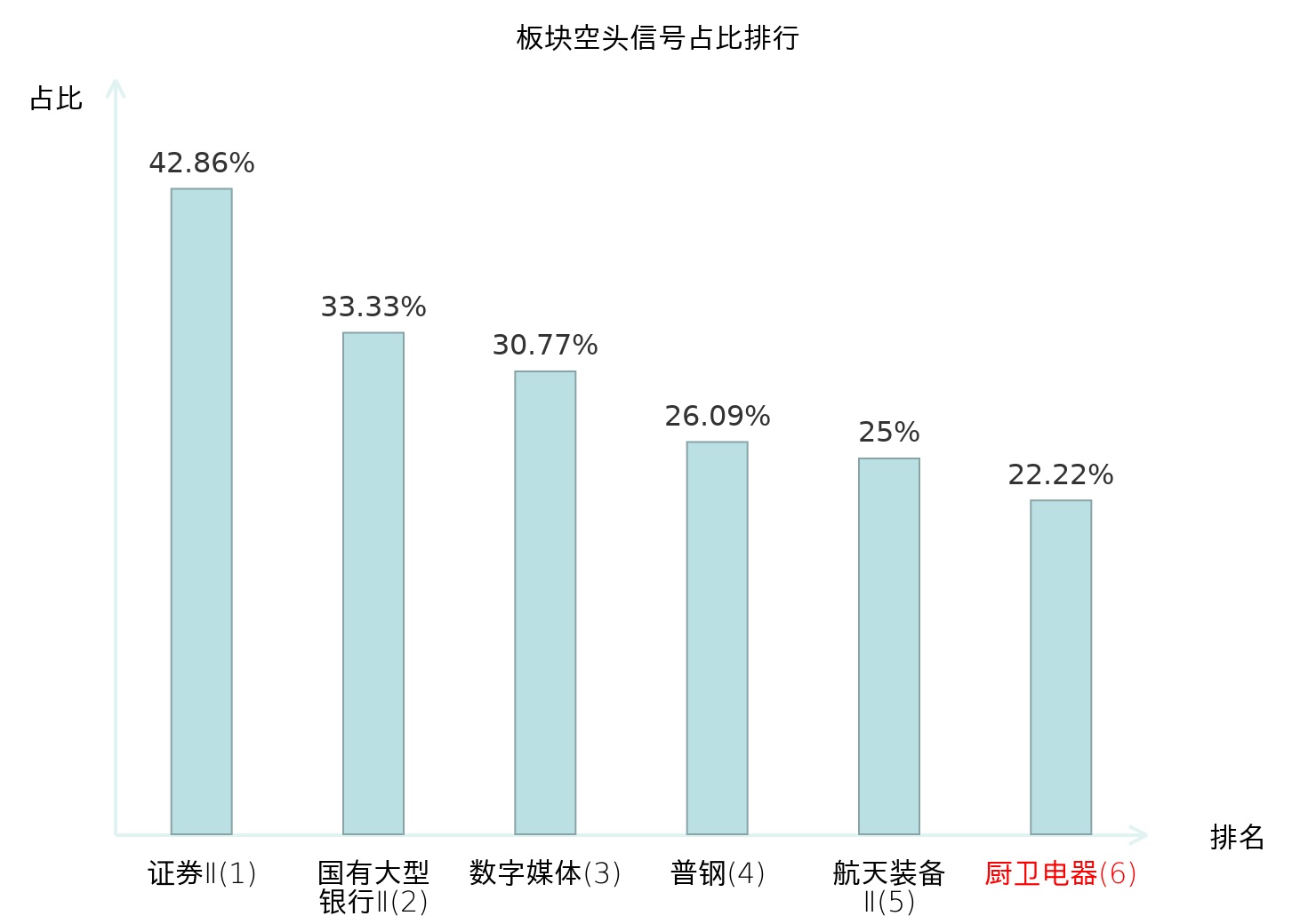 全市场所有行业板块中主力空头信号占比排名中,证券Ⅱ板块位居第一。证券Ⅱ板块名次提升最快,较昨日上升127位。