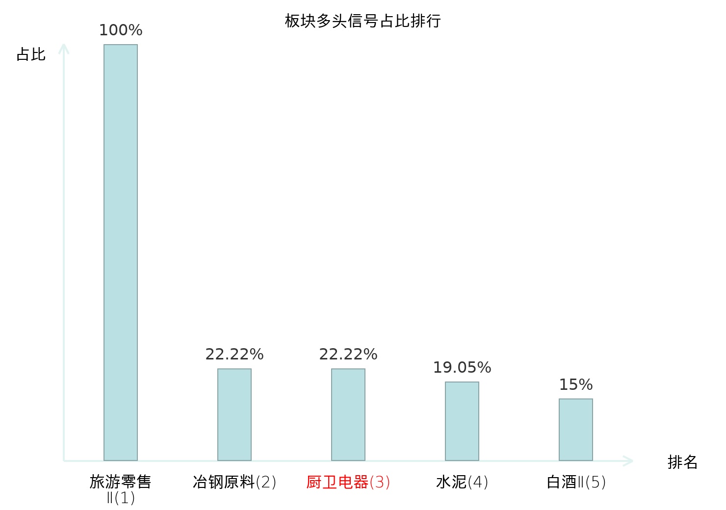 全市场所有行业板块中主力多头信号占比排名中,旅游零售Ⅱ板块位居第一。旅游零售Ⅱ板块名次提升最快,较昨日上升130位。