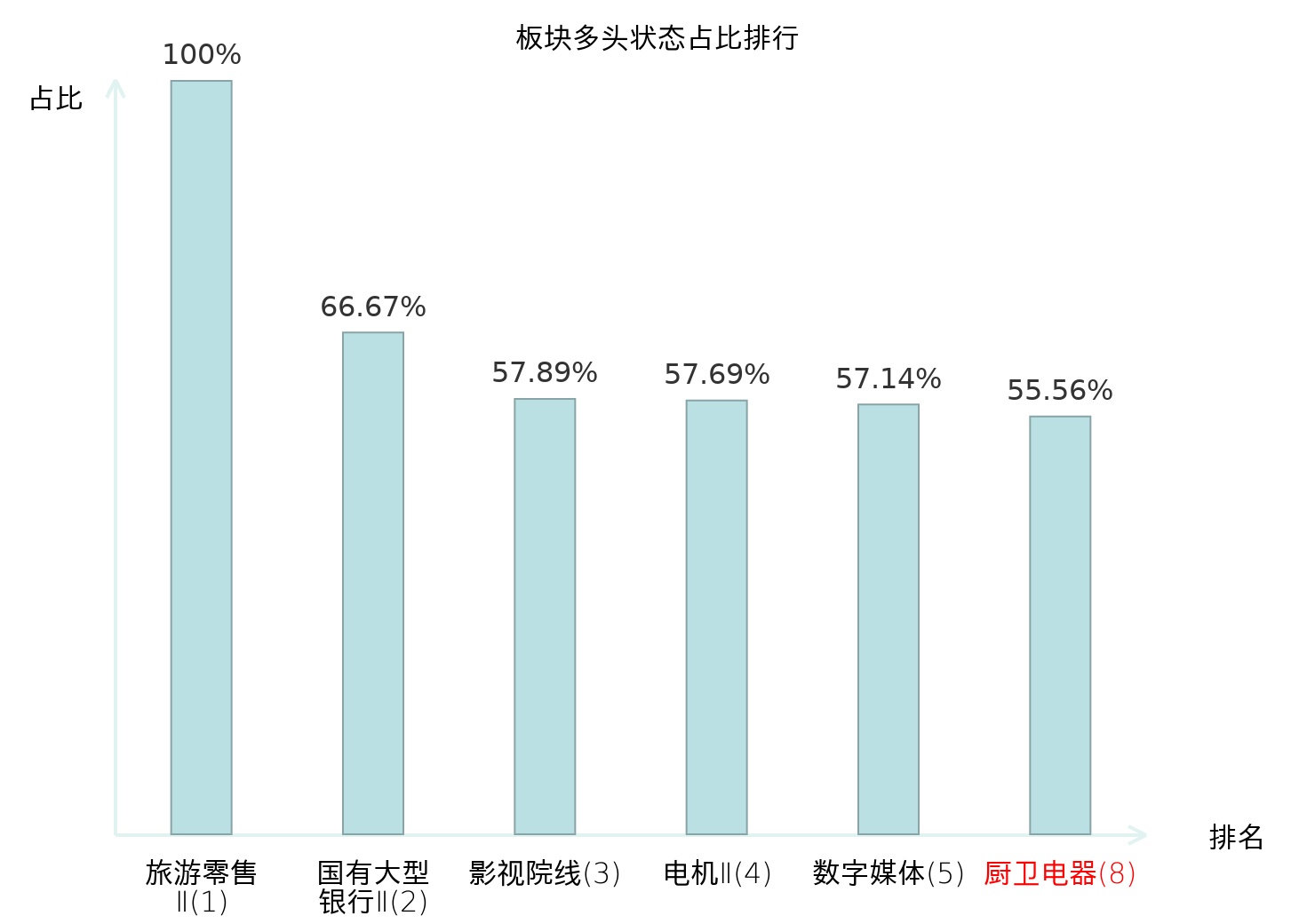 全市场所有行业板块中主力多头状态占比排名中,旅游零售Ⅱ板块位居第一。专业连锁Ⅱ板块名次提升最快,较昨日上升56位。