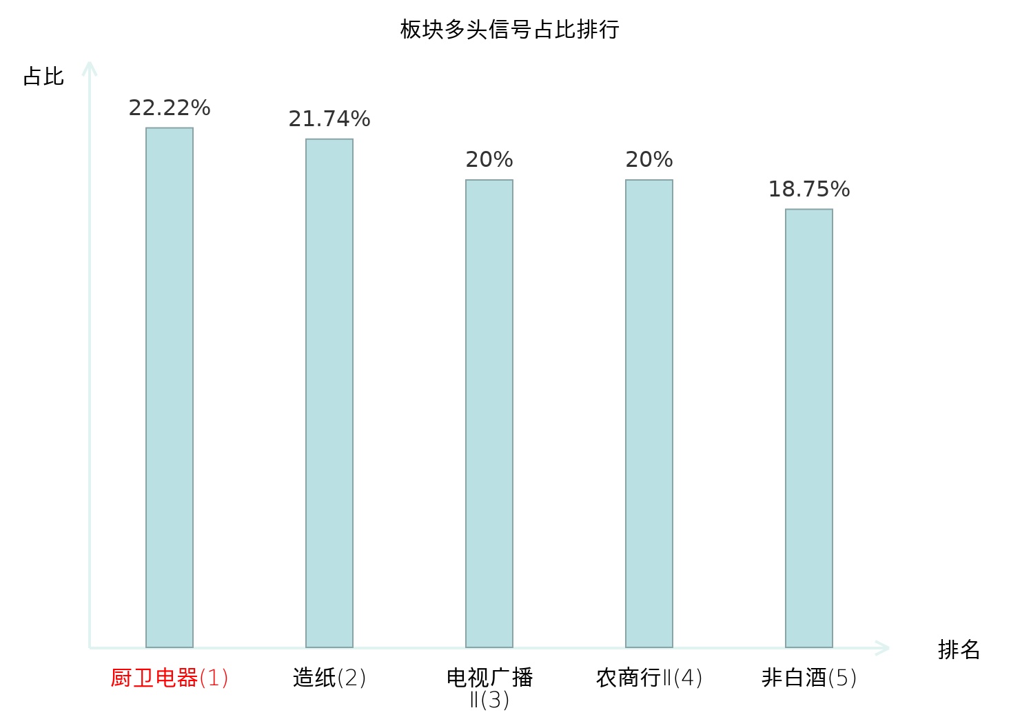 全市场所有行业板块中主力多头信号占比排名中,厨卫电器板块位居第一。厨卫电器板块名次提升最快,较昨日上升115位。