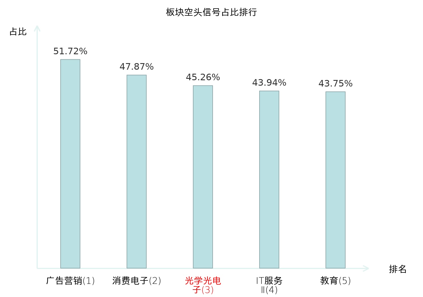 全市场所有行业板块中主力空头信号占比排名中,广告营销板块位居第一。广告营销板块名次提升最快,较昨日上升115位。