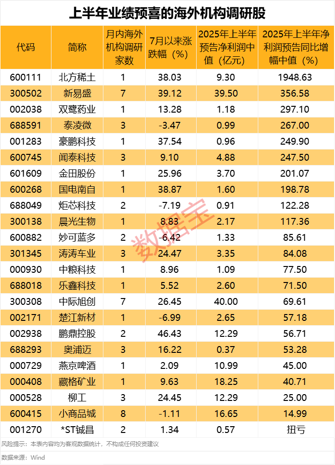 从业绩增幅来看,北方稀土、新易盛、双鹭药业、泰凌微等10股今年上半年净利润增幅预计超100%。