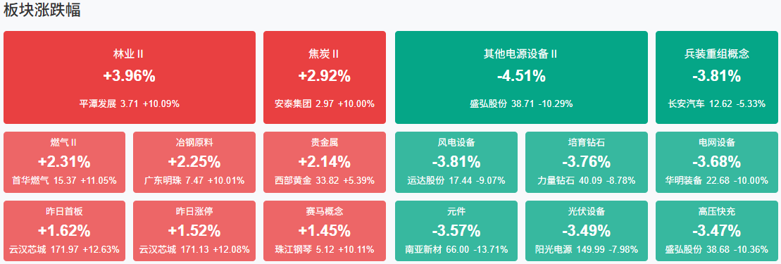 板块方面,燃气、贵金属、港口航运、煤炭等板块涨幅居前,风电、光伏等板块跌幅居前。截至收盘,沪指跌1%,深成指跌1.99%,创业板指跌2.37%。