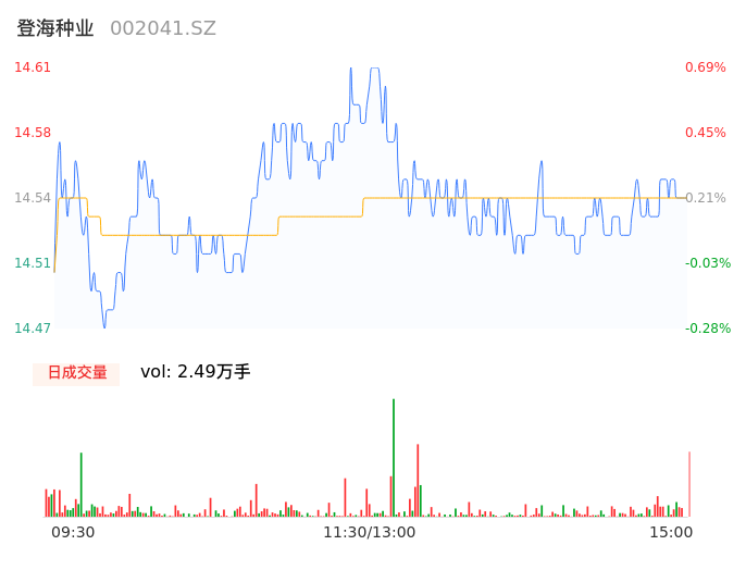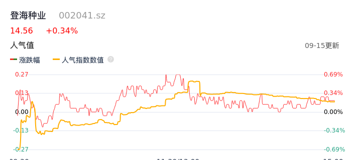 09月15日,登海种业收报14.56,股价涨幅0.34%,成交金额3626.44万元,换手率0.28%。