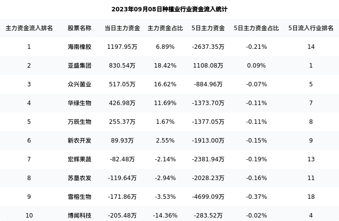 从主力资金流向来看,种植业行业今日主力资金流入3.36亿元,在所有申万二级行业中排名:68/131。