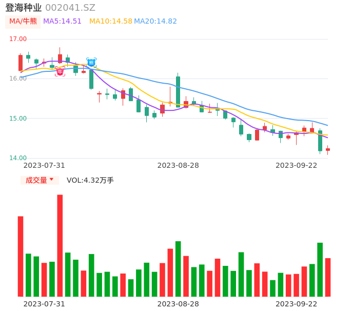 09月22日,登海种业收报14.24,股价涨幅0.42%,成交金额6148.26万元,换手率0.49%。