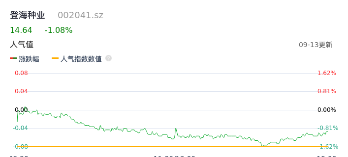 09月13日,登海种业收报14.64,股价涨幅-1.08%,成交金额2727.00万元,换手率0.21%。