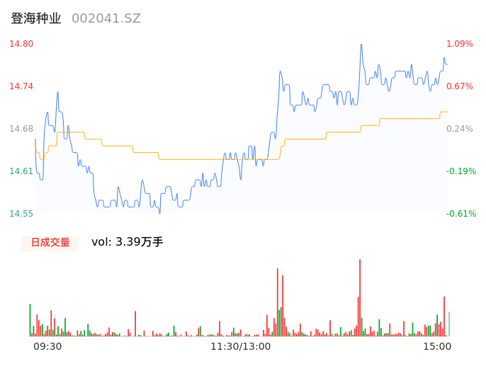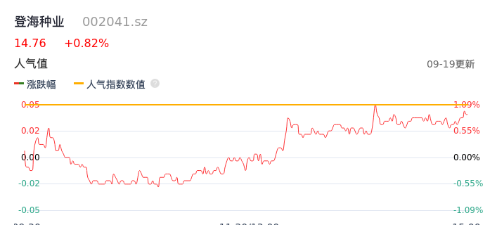 09月19日,登海种业收报14.76,股价涨幅0.82%,成交金额4977.35万元,换手率0.38%。