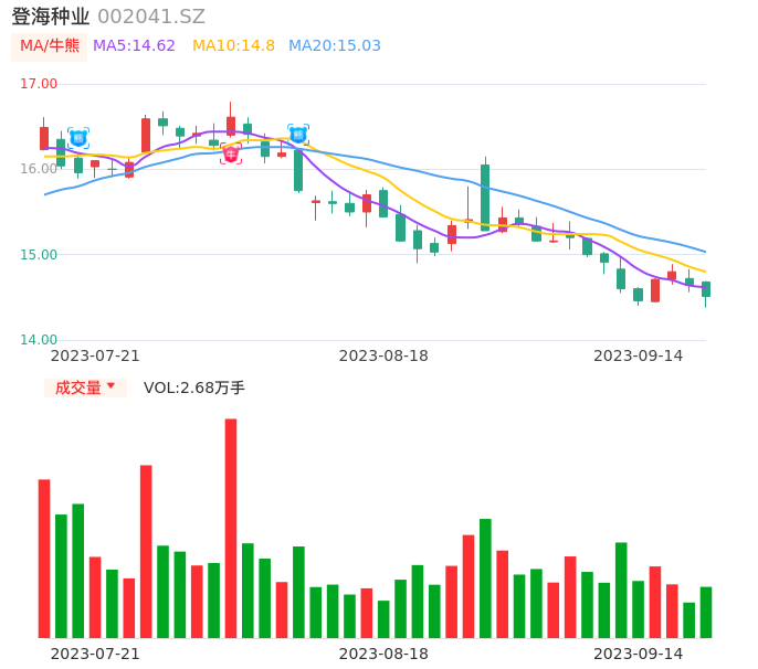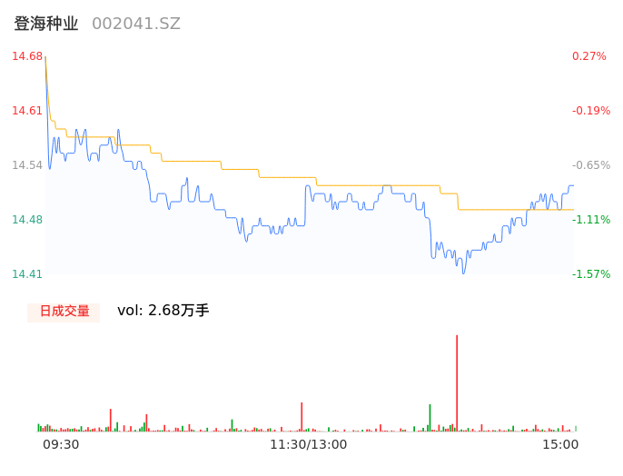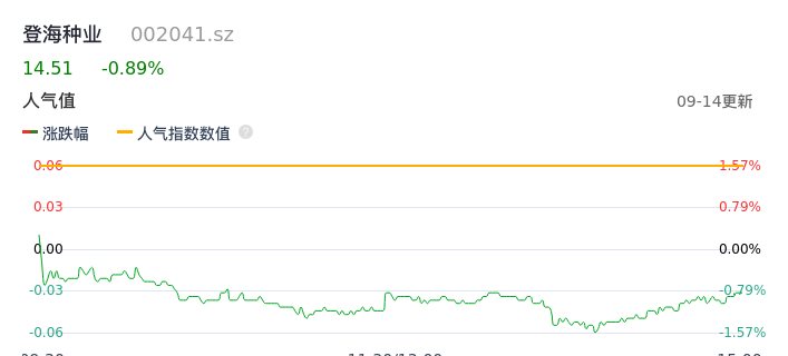 09月14日,登海种业收报14.51,股价涨幅-0.89%,成交金额3879.08万元,换手率0.30%。