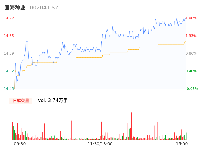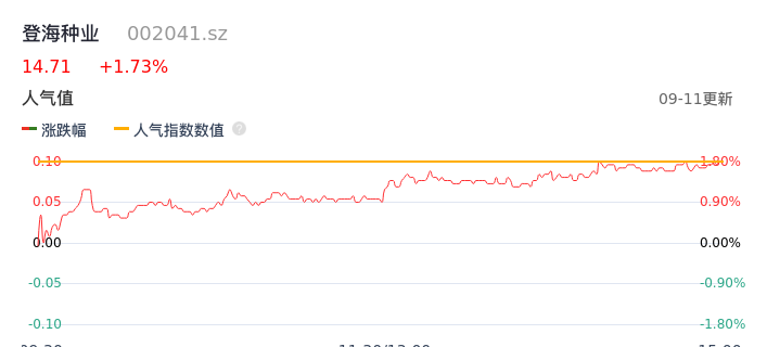 09月11日,登海种业收报14.71,股价涨幅1.73%,成交金额5475.62万元,换手率0.43%。