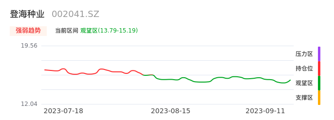 我们来看一下该股的九方特色指标强弱趋势的情况:登海种业自08月09日从持仓区下穿到观望区。股价近期持续下跌后,短期出现止跌迹象。后续重点关注能否再次站上多空分界点:15.19元。如未能有效突破则可能进入新一轮空头行情。