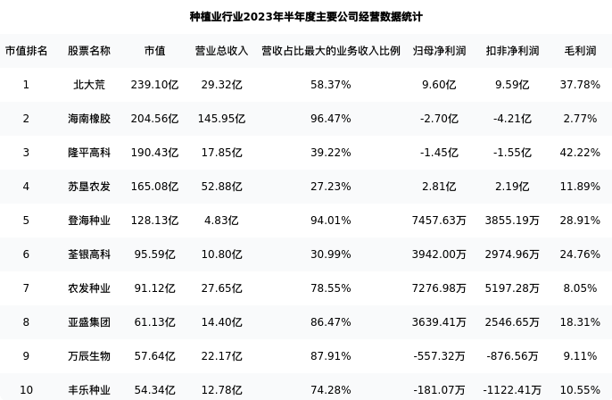 登海种业最新报告期数据为半年度,下表汇总了种植业行业内市值靠前的公司半年度主要经营数据