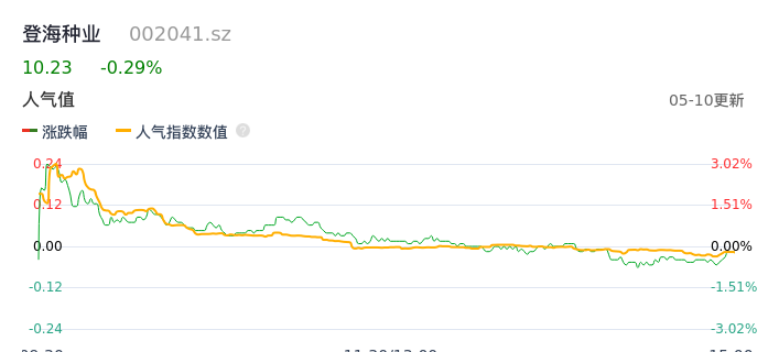 05月10日,登海种业收报10.23,股价涨幅-0.29%,成交金额1.75亿元,换手率1.91%。