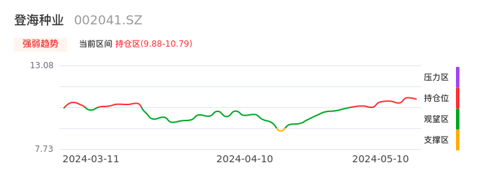 我们来看一下该股的九方特色指标强弱趋势的情况:登海种业自05月06日从观望区上穿到持仓区。股价近期在多头区域回调整理。后续重点关注多空分界点的争夺:9.88元。如未能有效站稳则可能重新回到空头行情。