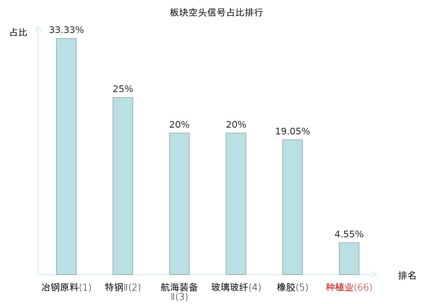 全市场所有行业板块中主力空头信号占比排名中,冶钢原料板块位居第一。军工电子Ⅱ板块名次提升最快,较昨日上升98位。