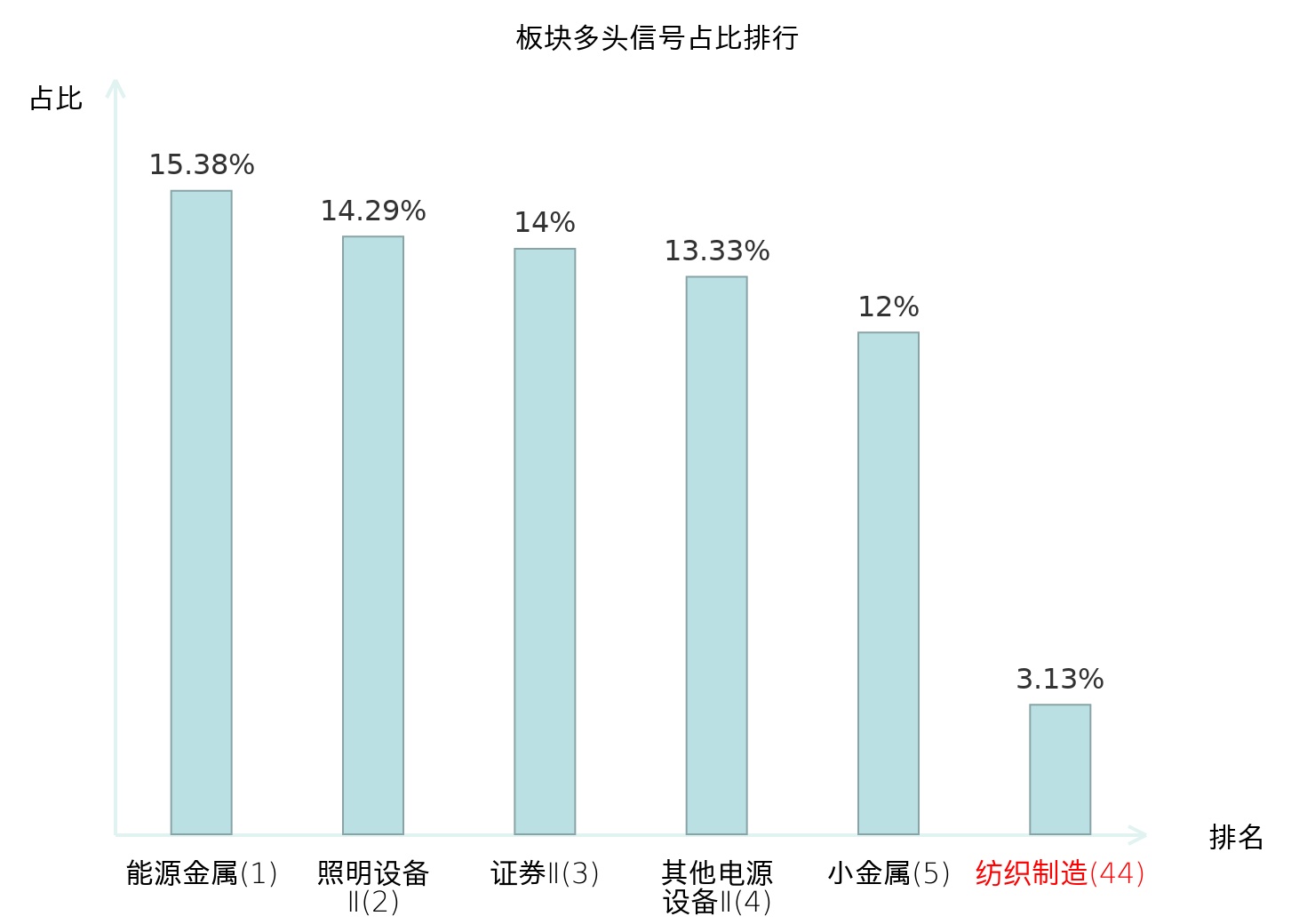 全市场所有行业板块中主力多头信号占比排名中,能源金属板块位居第一。贵金属板块名次提升最快,较昨日上升101位。