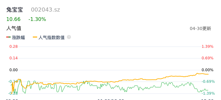 04月30日,兔宝宝收报10.66,股价涨幅-1.30%,成交金额1.55亿元,换手率1.99%。