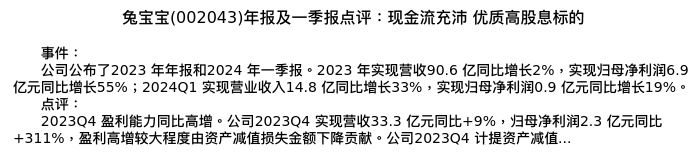 值得注意的是:2024年04月东北证券的濮阳/庄嘉骏分析师,首次发布关于兔宝宝的研究报告,标题为:兔宝宝(002043)年报及一季报点评:现金流充沛 优质高股息标的。