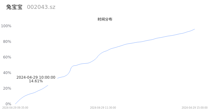 002043兔宝宝2024年04月29日成交27.95万手,成交金额2.99亿元,相较昨日缩量9392手,换手率3.83%,成交清淡。