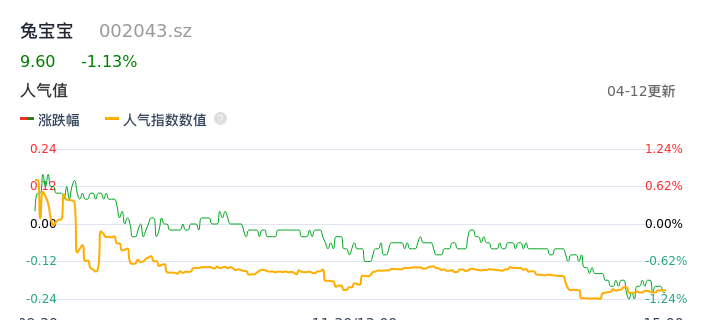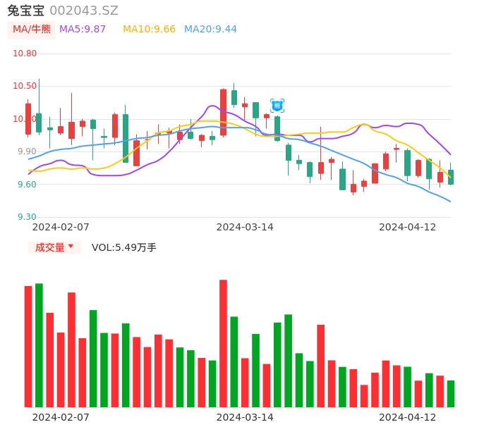 04月12日,兔宝宝收报9.60,股价涨幅-1.13%,成交金额5314.34万元,换手率0.75%。