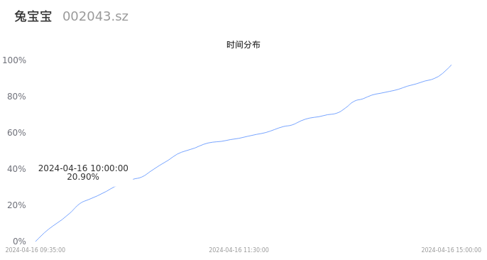 002043兔宝宝2024年04月16日成交9.76万手,成交金额9331.87万元,相较昨日放量1.30万手,换手率1.34%,成交清淡。