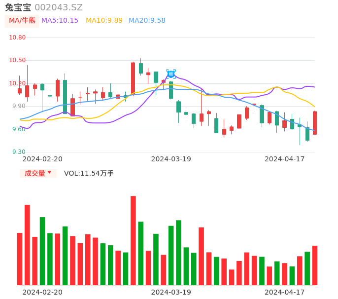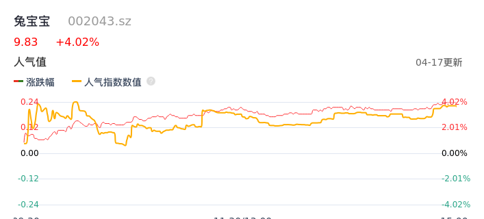 04月17日,兔宝宝收报9.83,股价涨幅4.02%,成交金额1.12亿元,换手率1.58%。