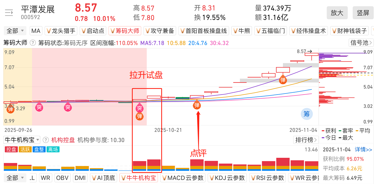 平潭发展在启动前期是有过主力明显拉升试盘的动作的,随后的两天下跌行情中,主力并没有卖出而是小买一点。主力觉得洗盘差不多,就在10月23号第一个反包板启动,我也是用这个指标捕捉到这个启动点,当天晚上的文章点评了平潭发展,随后就是主力一路拉升一路买入的行情。如果不太会看盘口和主力资金动向,又经常被洗下车的朋友,可以用牛牛机构宝指标来作为参考。点击此处解锁【牛牛机构宝】