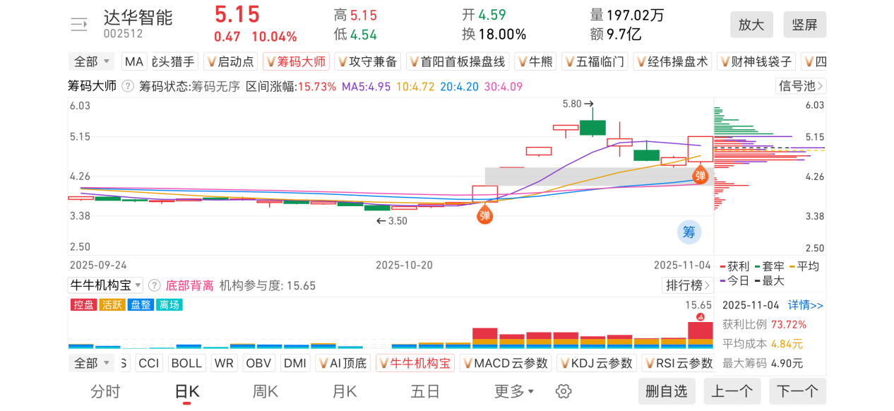 1)20251104-达华智能-【筹码大师】和【牛牛机构宝】-近期出现弹信号且底部量柱由绿转红