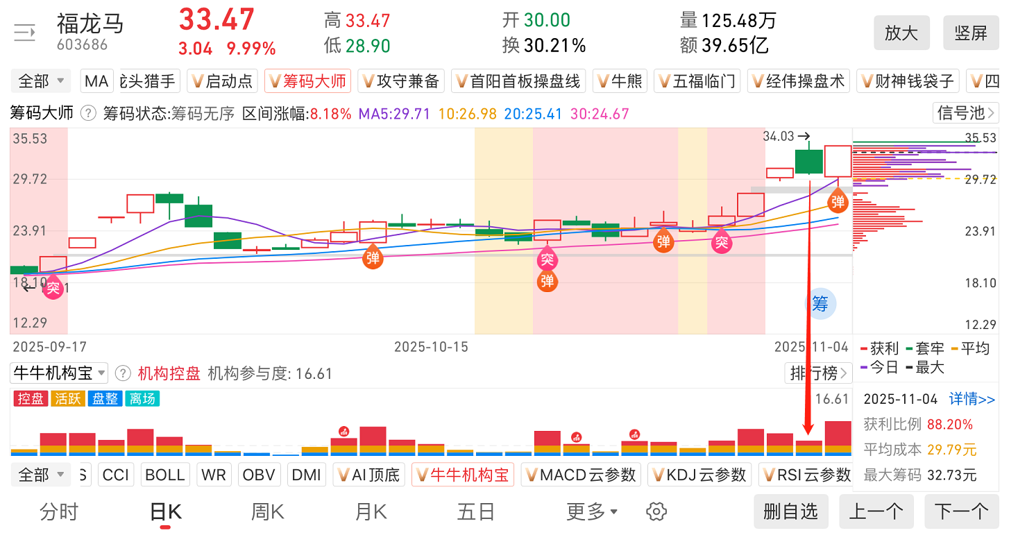 纯炒作的板块重点在于监控主力资金的动向,福龙马昨天虽然是个阴线,用传统的观点就是认为主力资金跑路了,行情结束了。通过牛牛机构宝这个指标就能看出机构资金十分活跃,甚至还在加仓。那就很明显了,股票下跌的时候机构资金还在买入,那就是洗盘。所以今天马字辈爆发的时候资金率先拉他充当龙头。