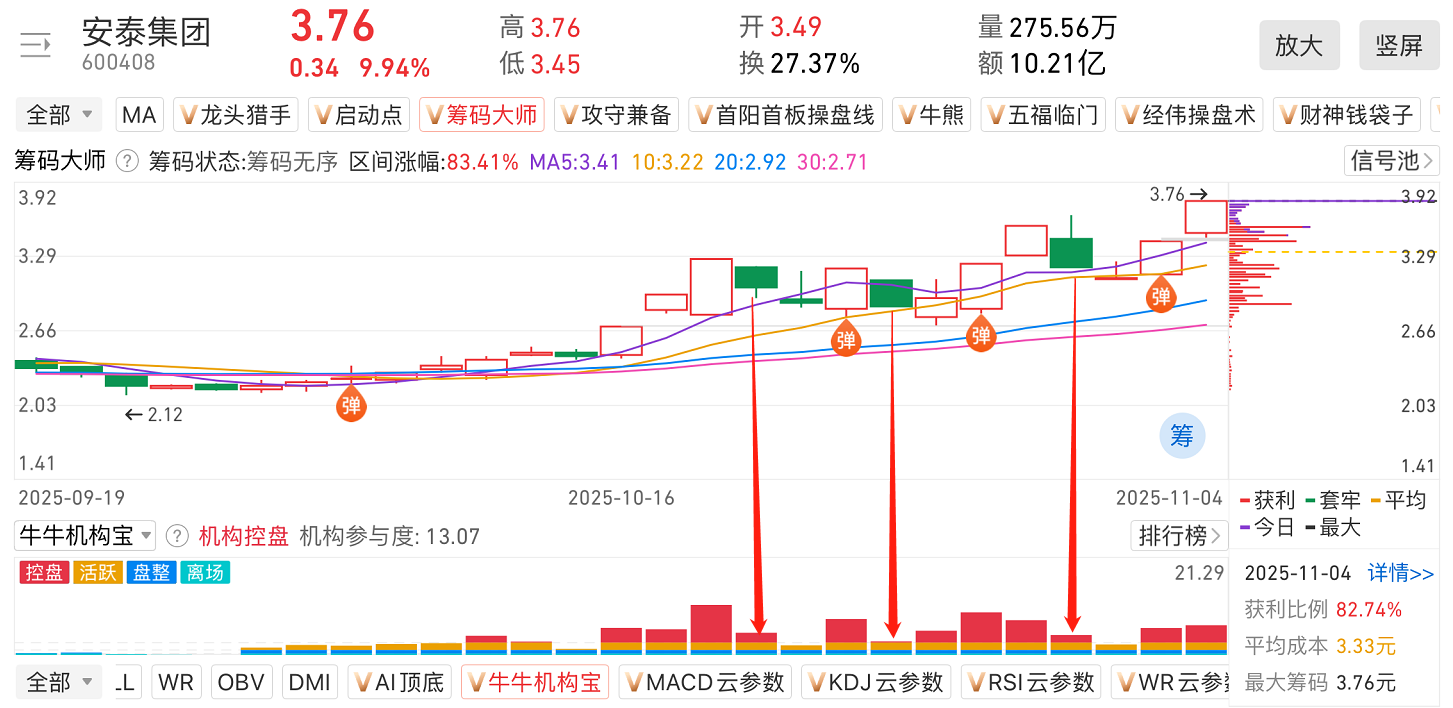 牛牛机构宝指标特别适合这种趋势涨停板行情。安泰集团可以说是主力洗盘非常狠的票了,这波行情有过两次跌停板,心态不好的投资者很容易就被洗下车。而用牛牛机构宝就可以清楚看出主力资金的动向,不用担心洗盘了。其中的三次大阴线都是有主力资金主动买入的动作的,下跌的时候主力都在主动买入,那就是洗盘。
