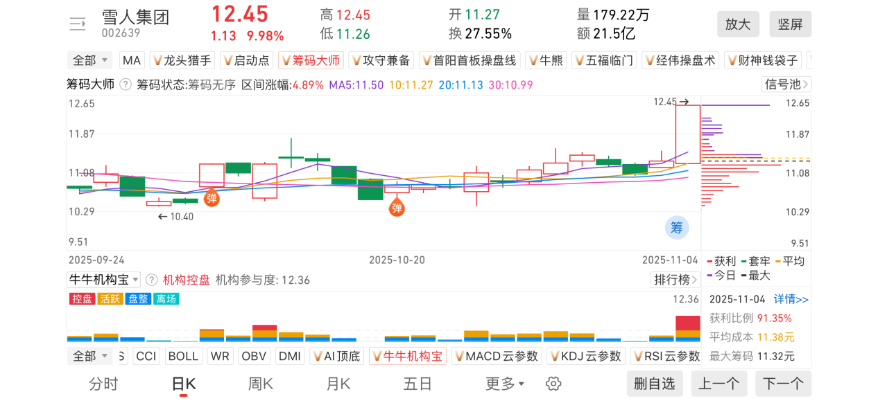 2)20251104-雪人集团-【筹码大师】和【牛牛机构宝】-近期出现弹信号且底部量柱由绿转红