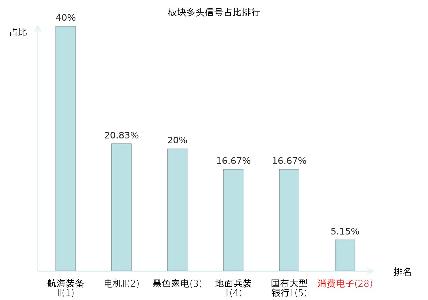 全市场所有行业板块中主力多头信号占比排名中,航海装备Ⅱ板块位居第一。国有大型银行Ⅱ板块名次提升最快,较昨日上升119位。
