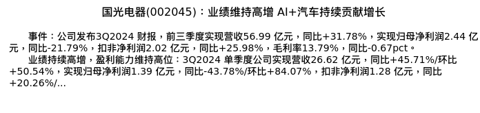 值得注意的是:2024年10月财通证券的张益敏分析师,首次发布关于国光电器的研究报告,标题为:国光电器(002045):业绩维持高增 AI+汽车持续贡献增长。