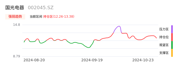 我们来看一下该股的九方特色指标强弱趋势的情况:国光电器自10月09日从压力区回到持仓区。股价近期持续调整。后续重点关注能否站稳多空分界点:12.26元。如被有效击穿则将进入空头行情。