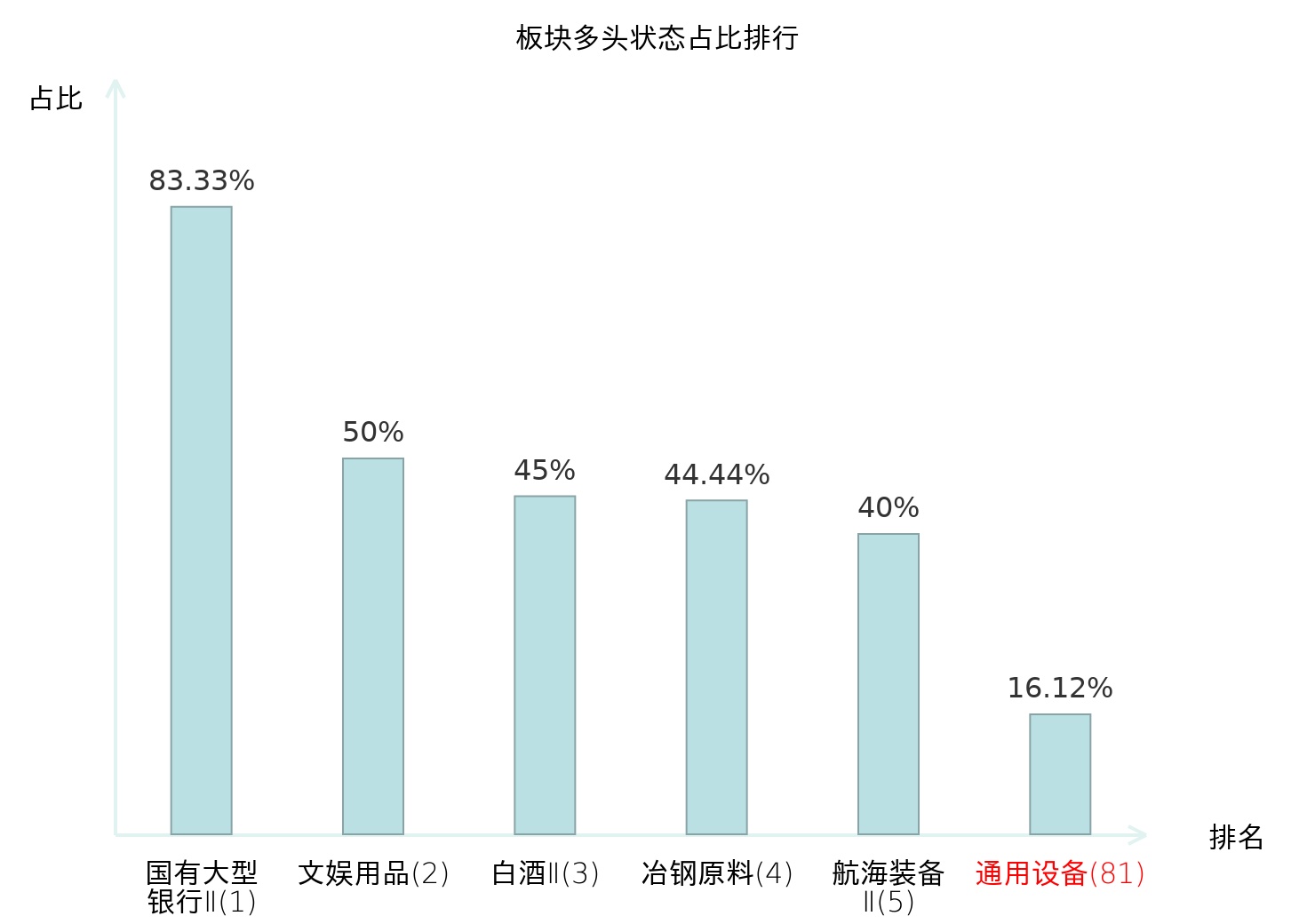 全市场所有行业板块中主力多头状态占比排名中,国有大型银行Ⅱ板块位居第一。其他家电Ⅱ板块名次提升最快,较昨日上升116位。