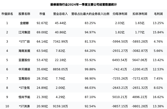宝鹰股份最新报告期数据为一季度,下表汇总了装修装饰行业内市值靠前的公司一季度主要经营数据