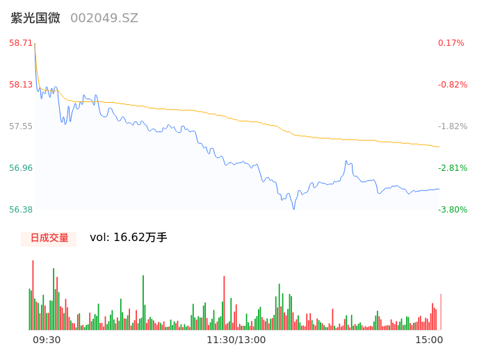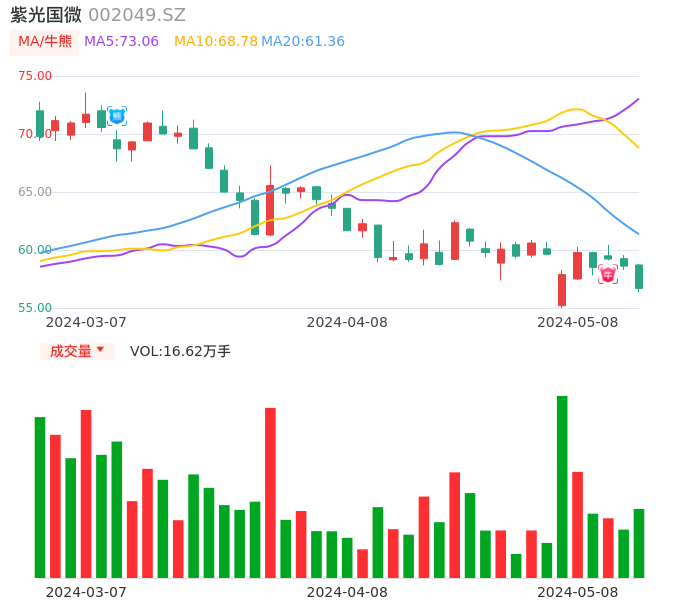 05月08日,紫光国微收报56.68,股价涨幅-3.29%,成交金额9.51亿元,换手率1.96%。