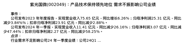 值得注意的是:2024年05月光大证券的刘凯/孙啸分析师,首次发布关于紫光国微的研究报告,标题为:紫光国微(002049):产品技术保持领先地位 需求不振影响公司业绩。