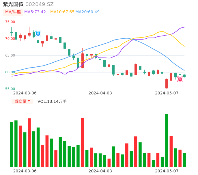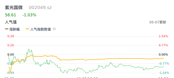 05月07日,紫光国微收报58.61,股价涨幅-1.03%,成交金额7.72亿元,换手率1.55%。