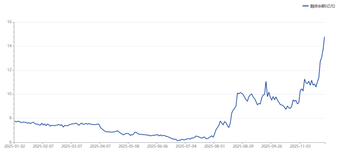 从资金端观察,赛微电子近期的融资余额规模显著抬升。截至11月26日数据,其目前融资余额规模达14.78亿元,较此轮7连涨行情前夕(11月18日)10.61亿元增长4.17亿元,增幅接近4成。其中,在11月19日至26日期间,赛微电子每日均获融资客加仓,尤其是在11月21日、26日,其单日融资净买额双双超1亿元。