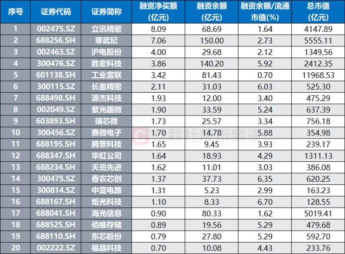 具体个股来看,以近2个交易日统计,截至11月26日数据,累计共有170只电子股获融资客加仓,占整个电子板块两融标的43.5%。其中,立讯精密、寒武纪、沪电股份、胜宏科技、工业富联融资净买额较高,分别达8.1亿元、7.1亿元、4.0亿元、3.9亿元、3.4亿元,此外,长盈精密、源杰科技、紫光国微、瑞芯微、赛微电子等股融资净买额也居前。