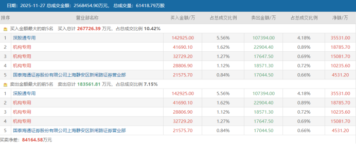 除获融资客近日集中“扫货”外,赛微电子同时也成为北向、机构资金和游资的共同重点关注方向。据其今日(11月27日)龙虎榜(三日榜)显示,买入榜、卖出榜共10个席位中,机构资金席位共出现6次,同时,深股通席位分别位居买一、卖一席位。此外,游资常用席位国泰海通证券上海静安区新闸路今日也登上其龙虎榜单。