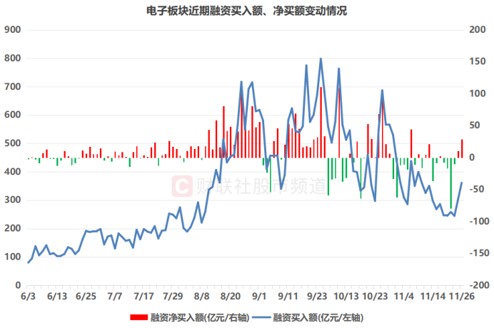 注:电子板块近期融资买入额、净买额变动情况(截至11月26日数据)
