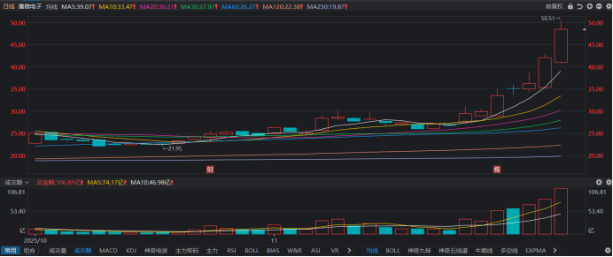 财联社11月27日讯(编辑 梓隆),今日(11月27日),芯片热股赛微电子再度迎来长阳拉升,截至收盘,其收涨近15.2%,为连续第7个交易日上涨,期间累计涨幅达81.2%。目前,赛微电子股价报收48.48元,盘中一度涨至50.51元,继续刷新历史新高纪录。
